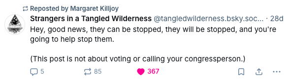 I’ve been dealing with this by trying to get rooted in my local community. I’m extremely lucky to have a strong radical/leftist/anarchist community where I live, and they have lots of great direct action1 projects to get involved with. I’ve put some time and energy into the local bail fund. I might not be able to do anything about mass deportation, but I can play a direct role in helping local people get out of cages. It feels good.